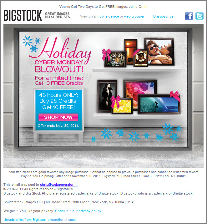 Het begint al slecht want dit stockfoto-bedrijf is een dochter van Shutter Stock. Waar ik vast wel eens een fotootje heb gekocht, maar dat wil niet zeggen dat elk dochterbedrijf me mag mailen. Hup, afmelden dus... ...