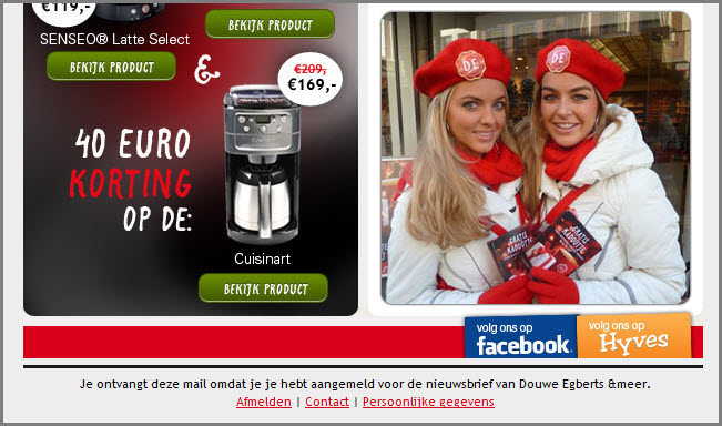 Niet verder vertellen, maar bij mij thuis worden fanatiek de spaarpunten uit de DE-koffiepakken geknipt (ik krijg ook echt genadeloos op m'n donder als ik dat een keer vergeet). Enfin, dientengevolge ben ik ook wel eens in de online DE-shop geweest en heb me daar aangemeld voor de nieuwsbrief.