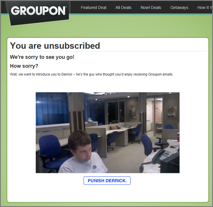 Van mij mag een nieuwsbriefverzender overigens altijd proberen me direct weer terug te winnen. Zoals hierboven óf zoals Groupon het probeert. Na een klik op de afmeldlink ben je direct afgemeld. Maar je krijgt nog wel een filmpje te zien gevolgd een "Resubcribe"-link. Klik hier voor het filmpje (klik op de button "Punish Derrick" om het filmpje te starten).