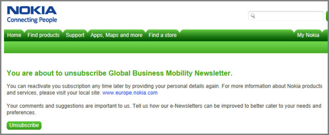 Ik meld me bijzonder gemakkelijk aan voor e-mail nieuwsbrieven. Bijvoorbeeld omdat ik er iets voor terug krijg (een interessante whitepaper bijvoorbeeld) of gewoon omdat de aanbieder van de nieuwsbrief me wel boeit. Maar ik wil me wel met hetzelfde gemak kunnen afmelden. Met één klik. Hup, klaar.