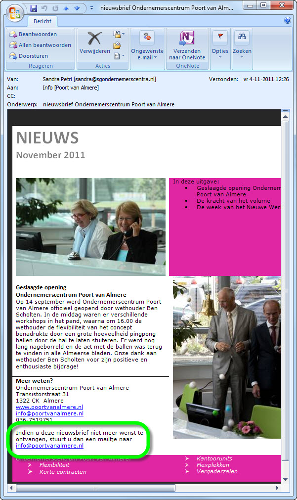 Ik ben graag aardig voor collega-ondernemers uit Almere maar kom niet onder deze oneervolle vermelding uit.(A) Had ik me nooit aangemeld voor deze nieuwsbrief en (B) hoezo moet ik een mailtje te sturen om er zeker van te zijn dat ik verder geen spam meer ontvang? Zó 1998. Net als het feit dat mijn e-mail adres waarschijnlijk met 200 andere adressen in het BCC-veld is gepropt.Schrale troost: die aardige dames achter de receptie gaan mijn afmelding vast persoonlijk handmatig verwerken in het ponskaartsysteem.