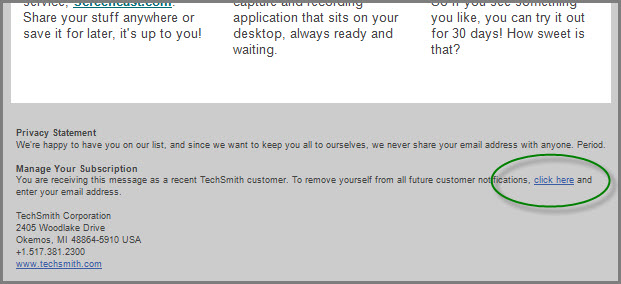Leverancier van m'n all-time favourite screen capture tool Snag-It. Maar ze mailen nogal veel, dus afmelden maar. Het is even zoeken naar de afmeldlink (corps 6)...
