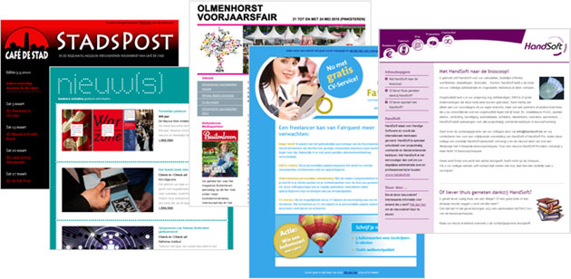 Dankzij het door ons geïmplementeerde nieuwsbriefsjabloon plaatst u zelf eenvoudig en effectief de inhoud per nieuwsbrief, zonder dat u zich zorgen hoeft te maken over een correcte opmaak. WebGenerator besteedt veel aandacht aan een correcte weergave van uw email nieuwsbrief in de verschillende email programma’s die in omloop zijn.