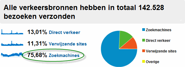 Nog maar eens een stukje cijfermateriaal uit onze eigen praktijk (weer gemeten over een jaar). Driekwart van onze bezoekers komt uit de zoekmachines… dat zijn aantallen die we niet zomaar in de waagschaal stellen op basis van een licht onbehagen over het uiterlijk van onze website.