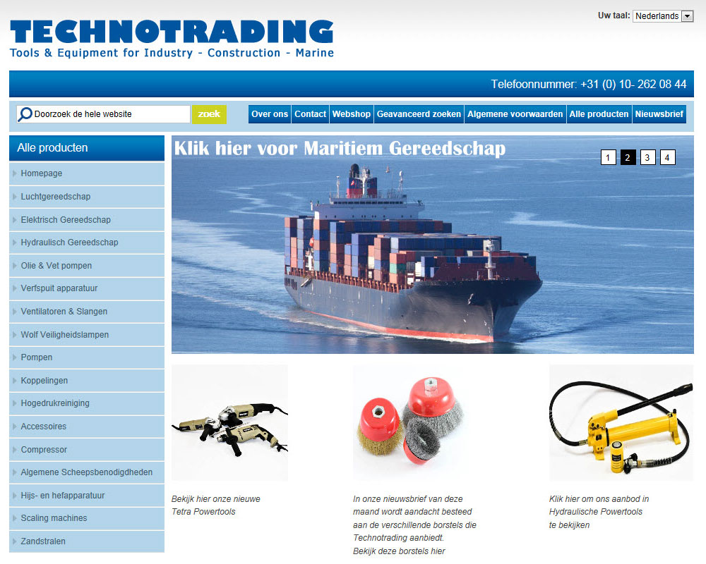 Technotrading is een technische groothandel voor de scheepvaart, de bouw, het garagebedrijf en de industrie. Het assortiment van Technotrading bestaat uit apparatuur voor industrieel onderhoud, zoals luchtgereedschap, hydraulisch gereedschap, elektrisch gereedschap, explosie veilige lampen, "airless" verfspuit apparatuur, takels, straal apparatuur, pompen en ventilatoren. Daarnaast heeft Technotrading een grote verscheidenheid aan accessoires, reserveonderdelen en toebehoren voor de verschillende producten. WebGenerator ontwikkelde en implementeerde voor Technotrading een Magento-webshop met een complexe koppeling naar het ERP- en ordersysteem van Technotrading. Vanuit dezelfde Magento beheeromgeving werden later ook meerdere andere store-fronts uitgerold met specifieke segmenten uit het productassortiment.