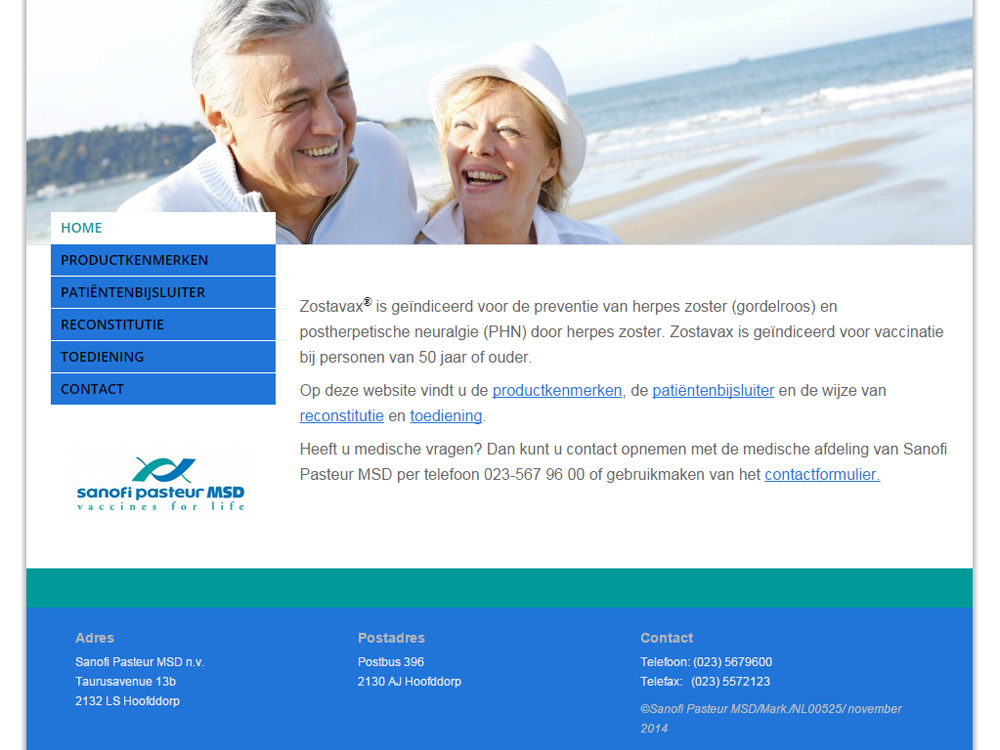 Sanofi Pasteur MSD houdt zich bezig met het ontwikkelen en vermarkten van een uitgebreid scala aan vaccins. Voor het medicijnZostavax® voor de preventie van herpes zoster (gordelroos) en postherpetische neuralgie (PHN) door herpes zoster, vroeg Sanofi Pasteur MSD WebGenerator een compacte, eenvoudig te onderhouden website op te zetten waarmee zowel patiënten als zorgprofessionals konden worden geïnformeerd. De website werd gebouwd in WordPress op basis van onze eigen Jumpstart theme, waarbij informatie voor zorgprofessionals wordt afgeschermd met een inlogfunctie.