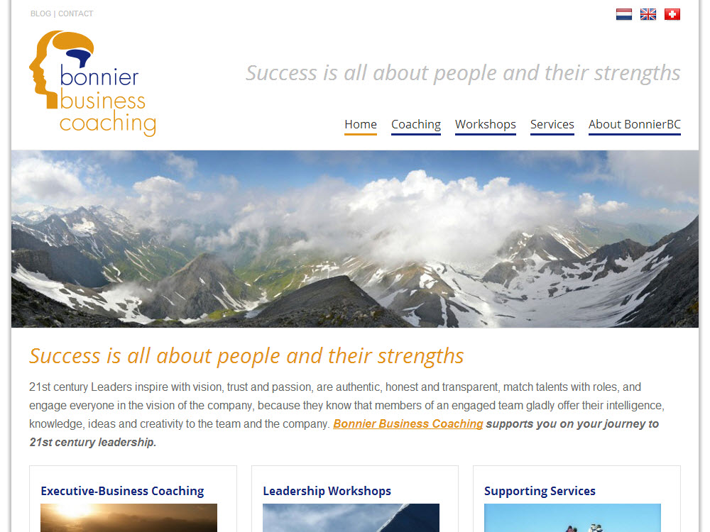 Bonnier Business Coaching biedt professionals, managers en ondernemers de structuur, begeleiding en verantwoordelijkheid die nodig zijn om een positieve verandering richting betere relaties, prestaties en kwaliteit van leven te realiseren. Joanita Bonnier, de ondernemer achter Bonnier Business Coaching, opereert vanuit Zwitserland en richt zich op een internationale doelgroep. Zij had daarom een meertalig website nodig in de talen Nederlands, Engels en Duits. WebGenerator ontwikkelde de website op basis van WordPress en implementeerde de WPML-plugin om de website in die drie talen te kunnen beheren.