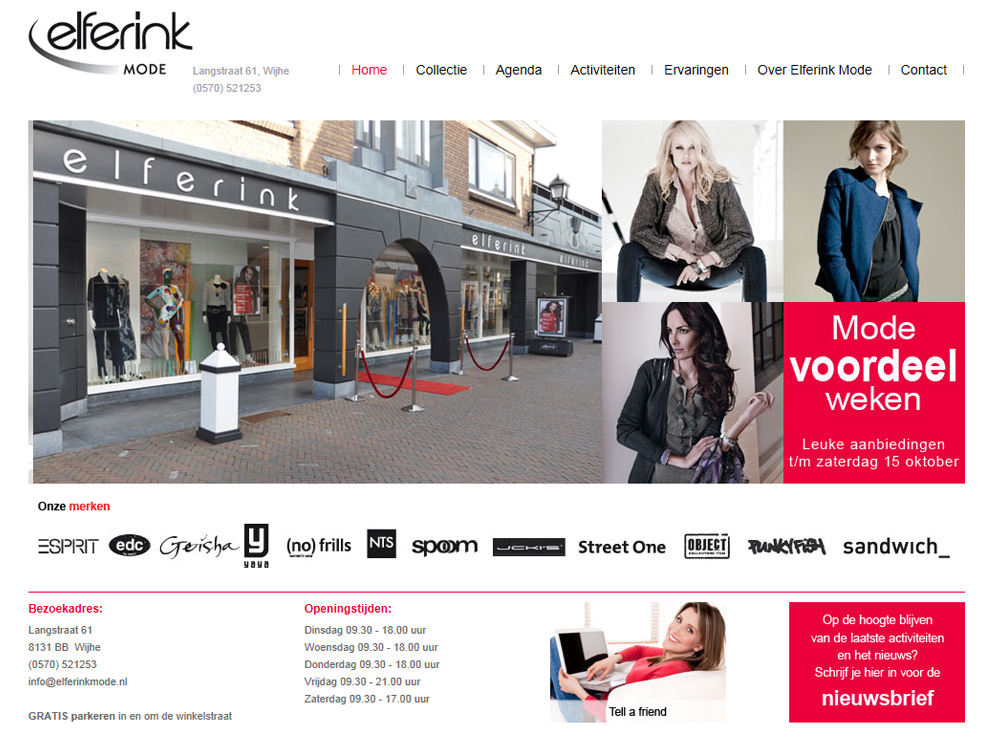 Elferink Mode is een lokale modezaak in Wijhe. In nauwe samenwerking met en op basis van een design door onze partner Twist Ontwerp implementeerde WebGenerator een nieuwe website. Voor de vele activiteiten die Elferink Mode organiseert kunnen bezoekers zich abonneren op een digitale nieuwsbrief. Een mooie site met veel beeld, korte teksten, inspirerend en activerend.