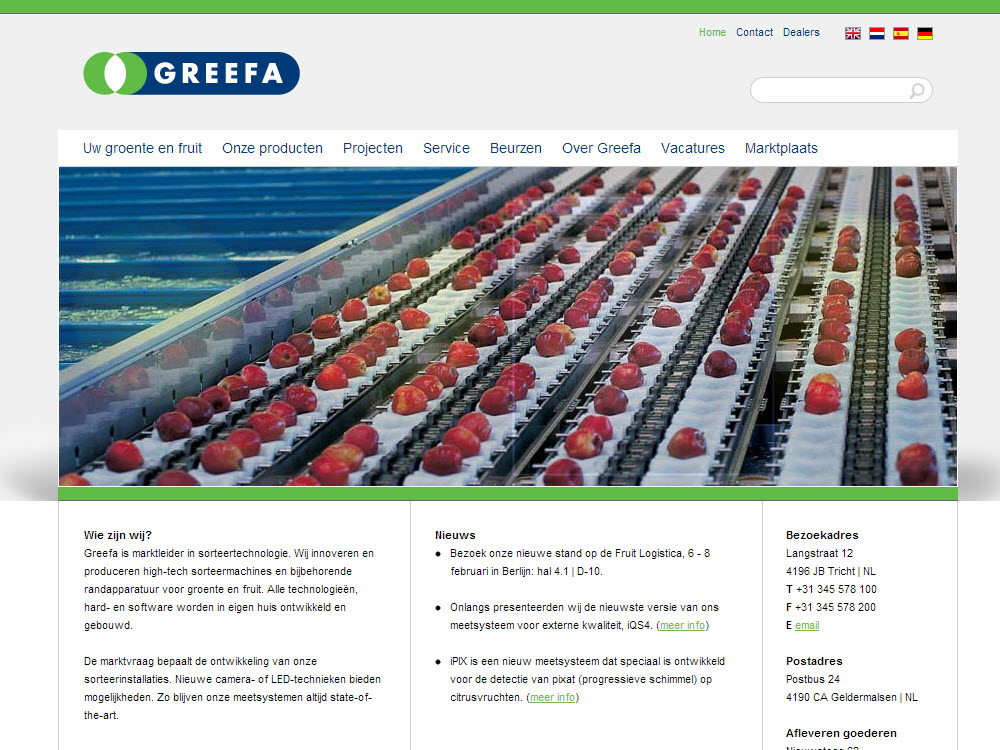 Greefa is al lange tijd klant bij WebGenerator: in 2006 leverden we een nieuwe website op in 9 talen met specifieke maatwerkmodules zoals een dealerlocator en online B2B-marktplaats. Een goede vindbaarheid, makkelijker beheer en meer technische mogelijkheden waren toen de vereisten waaraan ruimschoots werd voldaan. Technisch voldeed de website nog steeds (mede door regelmatige door ontwikkeling en onze gratis CMS-updates) maar cosmetisch was de site na 6 jaar wel aan een nieuw jasje toe. Zo gezegd, zo gedaan. Het webdesign werd verzorgd door onze partner Belindada en WebGenerator zorgde voor de technische implementatie ervan. Zo kan Greefa weer jaren vooruit.