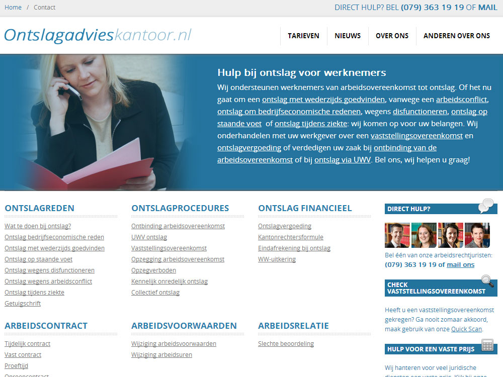 De website Ontslagadvieskantoor.nl is een initiatief van onze klant Vijverberg Juristen uit Zoetermeer. De website biedt uitgebreide informatie over de rechten en mogelijkheden van werknemers in ontslagsituaties. WebGenerator ontwierp een webdesign op maat en de website werd qua contentstructuur nadrukkelijk ingericht voor een optimale vindbaarheid in de zoekmachines. Ook werden formulieren met iDeal-betaalfunctie ingericht zodat specifieke adviesdiensten direct online afgerekend kunnen worden.