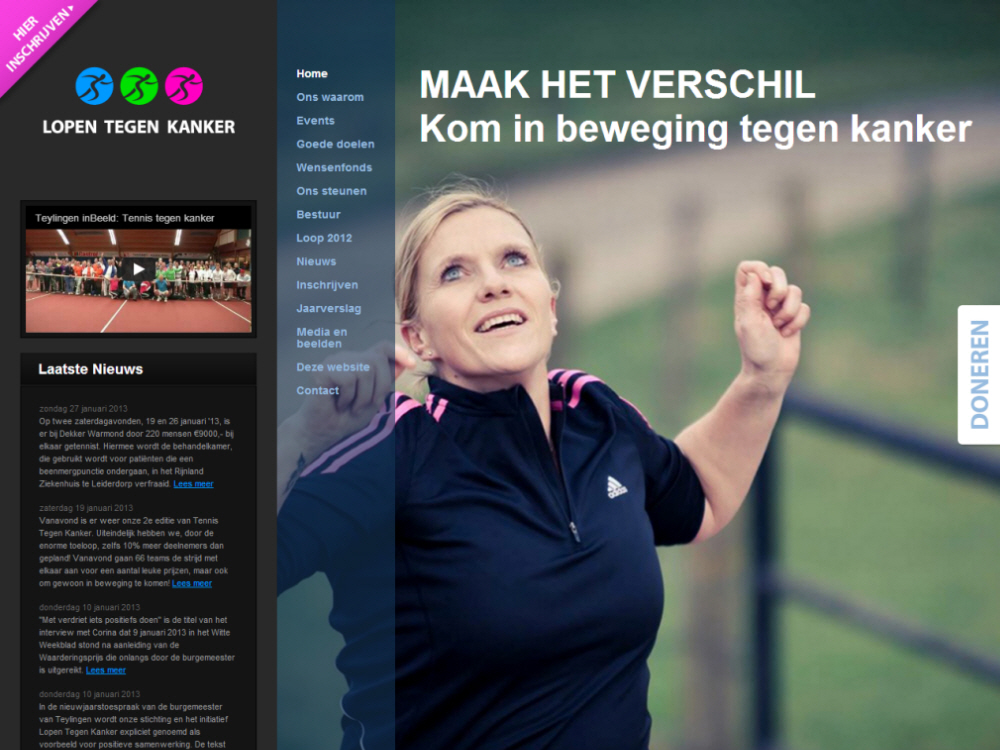 De Stichting Lopen Tegen Kanker is er om de strijd aan te gaan tegen kanker en om mensen die getroffen zijn door kanker te steunen. Het stichtingsbestuur bestaat uit vrijwilligers die ieder voor zich hun eigen redenen hebben waarom ze zich inzetten voor dit goede doel. Vaak omdat het woord kanker voor hun een speciale betekenis heeft gekregen maar ook omdat ze gewoon iets willen doen en willen helpen. De grote gemene deler is dat ze samen het verschil willen maken. De Stichting benaderde WebGenerator met de vraag of wij een steentje wilden bijdragen in de vorm van de realisatie van een nieuwe website. Dat wilden we graag. Het design werd gerealiseerd door Ron Driessen en WebGenerator zorgde ervoor dat de stichting de website eenvoudig zelf kon onderhouden.