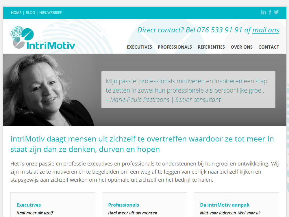 intriMotiv tilt professionals - zowel individueel als in teamverband - naar een hoger performance-niveau door een geheel eigen aanpak in training en coaching. Voor de eigen website had intriMotiv ook een betere performance voor ogen. Op aanraden van een wederzijdse relatie werd contact gezocht met WebGenerator. We ontwierpen en implementeerden een strakke WordPress-website op basis van ons eigen Jumpstart-model. Het belangrijkste werk werd echter misschien wel verzet in de voorafgaande gesprekken met intriMotiv en (SEO) copy writer Rutger Steenbergen, waaruit een duidelijk beeld naar voren kwam over wat de website moest vertellen en vooral ook hoe. De door Rutger geschreven teksten werden door WebGenerator in de website geplaatst, waarna intriMotiv zelf het verdere contentbeheer ter hand nam.