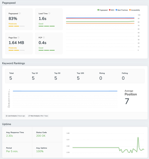 screpy seo rapport, overzicht website snelheid en weergave uptime
