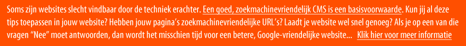 We hopen dat deze SEO tips je helpen in het dagelijkse, zoekmachine-vriendelijke onderhoud van je website. Heb je het gevoel dat jouw website of het systeem waarmee je het beheert niet de mogelijkheden bieden om deze SEO tips in de praktijk te brengen? Misschien kunnen we je dan helpen. We zijn geen zoekmachine-optimalisatiebureau, maar kunnen wel heel goed zoekmachinevriendelijke websites bouwen.