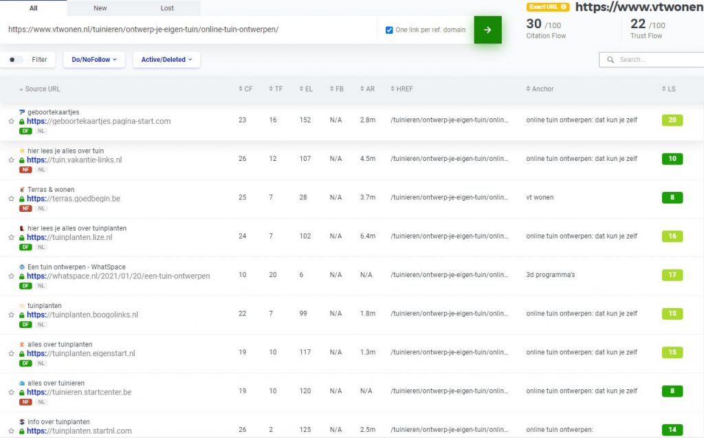 De gevonden linkjes kun je dus gelijk controleren op de trust/kwaliteit. Als vuistregel kun je een minimale TF van 15 hanteren. Linkjes met een hoge trustflow verhogen de trustflow van jouw eigen website en daarmee de kans om hoger in Google te ranken.