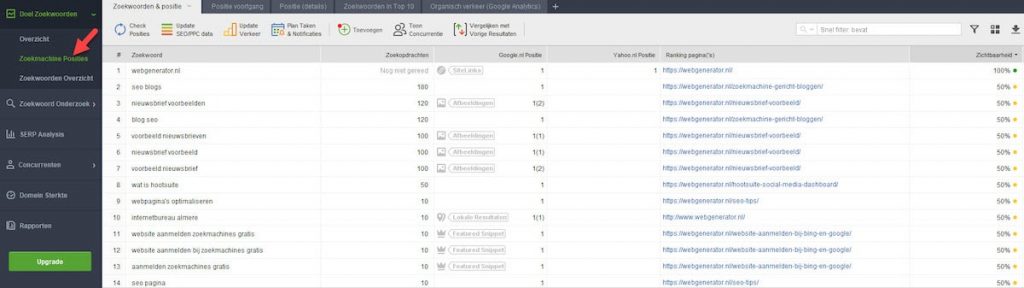 Overzicht van posities van webgenerator.nl m.b.v. Rank Tracker