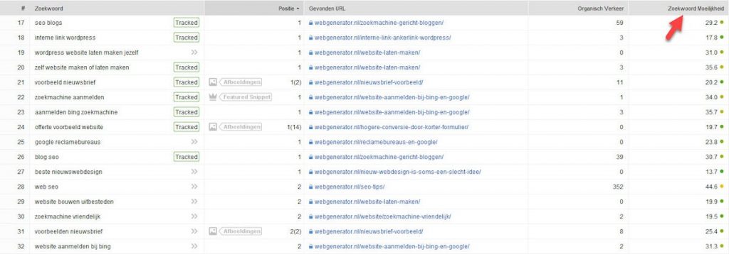 Dat kun je doen met behulp van diverse tools. Zo heeft de eerder genoemde tool, Rank Tracker, een functie waarmee je de ‘zoekwoordmoeilijkheid’ kunt onderzoeken. De zoekwoordmoeilijkheid geeft aan hoe sterk de online concurrentie op een zoekwoord is. De score wordt uitgedrukt in een getal tussen 0-100. Hoe hoger het getal, hoe lastiger het is om een hoge positie in Google te bemachtigen.